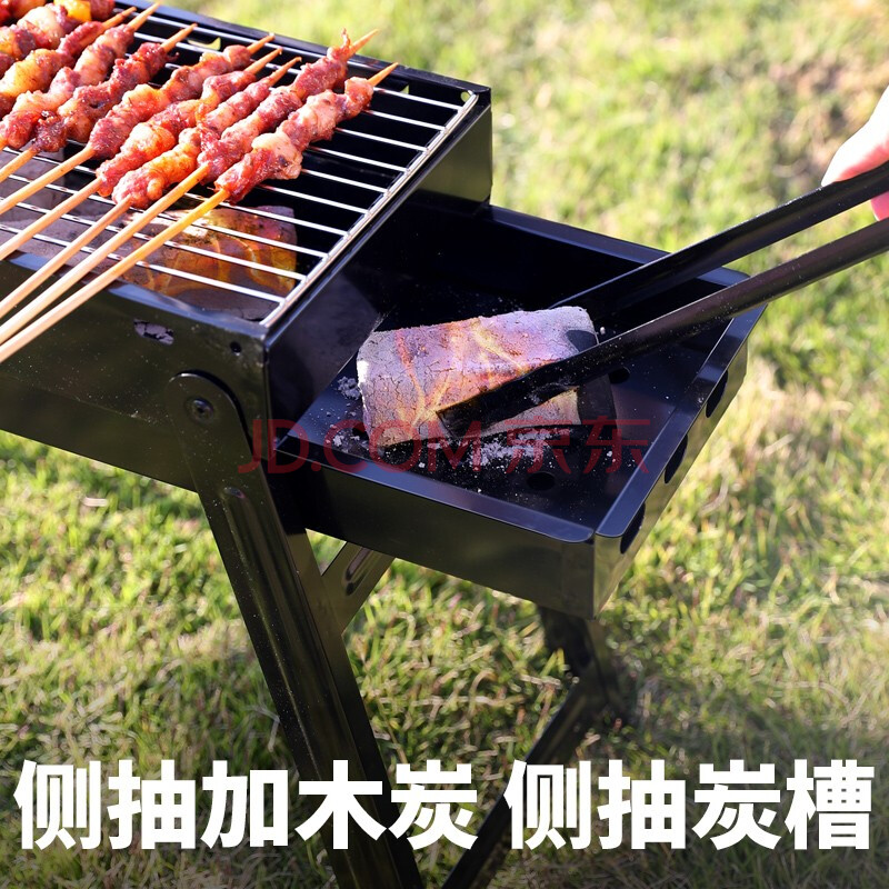 重量大小:架子轻盈折叠非常方便, 便携性能:重量轻,折叠后体积小不占很大空间 热源类型:非常好用,只要点燃碳后很容易引燃加进去的新碳。 用料材质:材质还是不错的,特别是竹签和烧网都是不锈钢材料 适用人数:适合3一5人用,只要有人一直烤也可以多人使用 室内室外:最好是在室外用,室内味道太大。